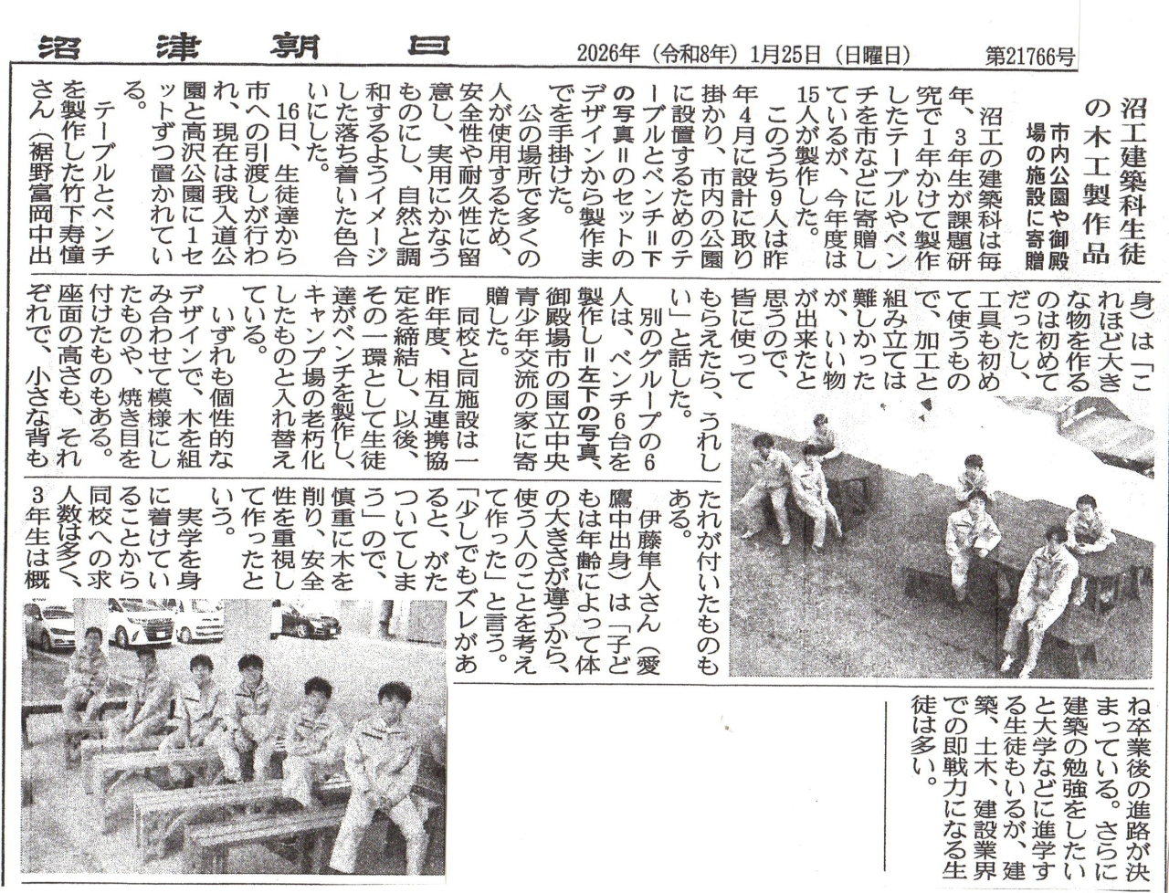1/25(日)今朝の沼朝に沼工建築科3年生が毎年1年かけて制作したテーブルやベンチなどを市等に寄贈しているという。